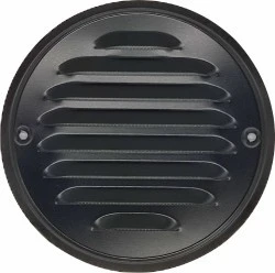 Metalowa kratka płaska okrągła ze skośnymi żeberkami z siatą przeciwko owadom. Wykonana z blachy cynkowanej malowanej na grafitowo. Wersja z otworami – przykręcana nie posiada króćca montażowego. Nadaje się dzięki temu do maskowania różnych otworów o średnicy mniejszej lub równej 100 mm.
