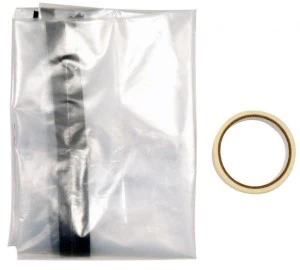 - Osłona przeciwpyłowa otworów drzwiowych wykonana z grubej, bezbarwnej, przezroczystej folii PE. Część otwierana ma kształt odwróconej litery L i otwierana jest wszytym zamkiem błyskawicznym. Mocowanie folii odbywa się za pomocą taśmy klejącej. Na krawędziach folii dodatkowo umieszczone 2 punktowe mocowania z silnej grubej taśmy.