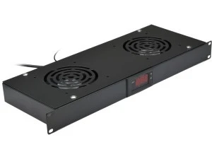 Wydajny panel wentylacyjny do szaf wiszących i stojących o standardzie RACK 19”. Dwu-wiatrakowy z wbudowanym termostatem do płynnej regulacji oraz cyfrowym wskaźnikiem do pomiaru bieżącej temperatury.