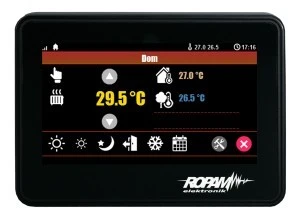 - Funkcja termostatu pokojowego (2 niezależne), tygodniowy kalendarz, pięć profili temperatury, cztery przedziały dzienne, synchronizacja z aplikacjami mobilnymi oraz innymi panelami (IP)