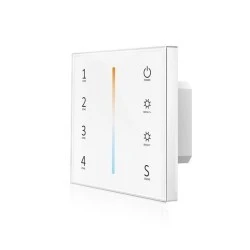 Panel LED naścienny marki Skydance to wysokiej jakości sterownik LED dedykowany dla instalacji składającej się z oświetlenia LED ze zmienną temperaturą barwową (np. taśma LED CCT). Panel do LED T12-1 pozwala na płynną kontrolę poprzez włączanie/wyłączanie, ściemnianie/rozjaśnianie oraz zmianę temperatury barwowej w zakresie 2700-6500K oświetlenia LED przy użyciu precyzyjnie działających dotykowych pól. Produkt z przeznaczeniem dla czterech stref z wykorzystaniem bezprzewodowej drogi radiowej. Urządzenie nadawcze T12-1 cechuje się w głównej mierze wysoką jakością wykonania oraz eleganckim wykończeniem.