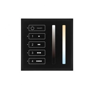 Czterostrefowy panel naścienny umożliwiający zarządzanie jasnością oraz temperaturą barwową w zakresie 2700-6500K dla taśmy LED CCT, za pomocą sygnału opartego na systemie sterowania DALI. Urządzenie zasilane bezpośrednio ze stacji DALI. Panel LED zasilany jest bezpośrednio ze stacji DALI, przez co nie potrzebuje dodatkowego zasilania ze strony baterii czy sieci 230VAC. Dostępne przyciski obrotowe na obudowie sterownika DALI umożliwiają ustalenie dowolnego adresu w przedziale od 0 do 64 oraz dowolnego grupy od 1 do 15. Produkt charakteryzuje się również dodatkową formą komunikacji, jaką jest droga radiowa oparta na częstotliwości 2,4Ghz.