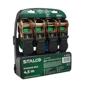 Pasy do ładunków to akcesoria wykorzystywane głównie w transporcie. Mają za zadanie zabezpieczyć towar znajdujący się na pace samochodu. Można zamocować nimi załadunek do burty auta. Sprawdzą się też przy spinaniu w całość kilku produktów. Szczególnie przydatne będą przy przewożeniu ciężkich konstrukcji, urządzeń, a nawet innych pojazdów. Pasy do ładunków STALCO są wykonane z włókien poliestrowych. Materiał jest odporny na wilgoć, promienie słoneczne, a także przetarcia i przebicie. Pojedynczy pas wytrzymuje obciążenie nawet do 700 kilogramów. Pasy mają dwuczęściową konstrukcję, co ułatwia mocowanie produktów o różnych wymiarach. Cały zestaw ma długość 4,5 metra. Pasy do ładunków składają się z haka i masywnej klamry z mechanizmem zapadkowym. Oba elementy są wykonane z trwałej stali węglowej i zabezpieczone lakierem oraz warstwą cynku. Dodatkowo klamra ma uchwyt pokryty tworzywem sztucznym. Jest wygodny w czasie zaciągania i chroni wnętrze pojazdu przed zarysowaniem. Pasy dostępne są w komplecie 4 sztuk o jednakowych wymiarach.
