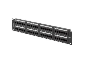 Patch panel wyposażony jest w 48 nieekranowanych portów RJ-45 kategorii 5E. Zastosowanie złącz IDC/LSA zapewnia łatwy i szybki montaż. Patchanel w zestawie posiada uchwyty zapewniające łatwą organizację kabli i stabilność montażu.