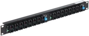 Na froncie panelu znajdują się dwa rzędy gniazd RJ-45. Panel jest w stanie dodać zasilanie do 16 urządzeń PoE.