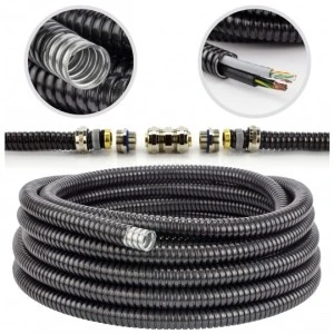 Wytrzymały, elastyczny, uniwersalny peszel karbowany wykonany ze stali galwanizowanej. Dodatkowo zabezpieczony czarną powłoką PVC odporną na promieniowanie UV, dzięki czemu może być montowany na zewnątrz.