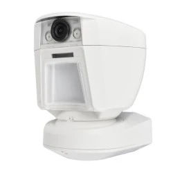 Bezprzewodowa czujka ruchu PIR z wbudowaną kamerą i komunikacją dwukierunkową, przeznaczona do montażu zewnętrznego.