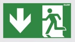 Piktogram PM26 100x300 strzałka dół człowiek w drzwiach logo awex (ISO7010)
