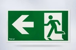 Piktogram PS24 125x250 strzałka lewo człowiek w drzwiach logo awex (ISO7010)