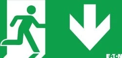 Piktogram PS26 125x250 strzałka dół człowiek w drzwiach logo awex (ISO7010)