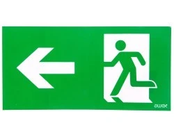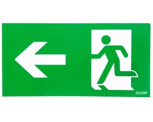 Piktogram PD24 140x300 strzałka w lewo człowiek w drzwiach logo awex (ISO7010)