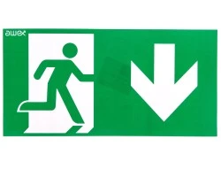 Piktogram PD27 150x300 strzałka w dół z prawej strony, człowiek w drzwiach logo awex (ISO7010)