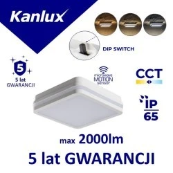 Plafoniera LED, Długość [mm]: 220, Szerokość [mm]: 220, Wysokość [mm]: 57, Barwa światła: ciepłobiała,biała, Czas działania czujnika [sekunda-minuta]: 5-5, Czas nagrzewania lampy [s]: ≤1, Czas zapłonu lampy [s]: ≤0,5, Częstotliwość pracy czujnika [MHz]: 5800, Częstotliwość znamionowa [Hz]: 50, Ilość cykli wł/wył: ≥30000, Jednolitość barw [SDCM]: 6, Kąt świecenia [°]: 110, Klasa ochronności przed porażeniem elektrycznym: II, Kolor: biały, Materiał klosza: PC, Materiał obudowy: PC, Miejsce montażu: do nadbudowania na ścianie, Miejsce montażu: do nadbudowania na suficie, Miejsce zastosowania: wewnątrz i na zewnątrz, Minimalna odległość od oświetlanego obiektu: 0,5m, Moc maksymalna [W]: 12 / 18, Możliwość współpracy ze ściemniaczem: nie, Napięcie znamionowe [V]: 220-240 AC, Nastawa poziomu natężenia oświetlenia, przy którym czujnik wykrywa ruch [lx]: 2/10/50/off, Regulacja czułości: 1, Rodzaj czujnika: mikrofalowy, Rodzaj diody: LED SMD, Rodzaj przyłącza: kostka samozaciskowa, Stopień IP: 65, Strumień świetlny oprawy [lm]: max 1840 / 2000 / 1980, Temperatura barwowa [K]: 3000/3500/4000, Trwałość [h]: 50000, Współczynnik oddawania barw Ra: 80, Wykrywanie ruchu: tak, Zakres przekrojów stosowanych przewodów [mm2]: 0,75÷1,5, Zakres temperatury otoczenia, na którą może być narażony wyrób [°C]: -15÷35, Zawartość rtęci: nie, Zintegrowane źródło światła LED: 1, Zastosowana technologia oświetleniowa: LED, Bezkierunkowe lub kierunkowe źródło światła: NDLS, Źródło światła zasilane lub niezasilane napięciem sieciowym: NMLS, Połączone źródło światła (CLS): nie, Źródło światła z możliwością zmiany barwy światła: nie, Źródło światła o wysokiej luminancji: nie, Osłona przeciwolśnieniowa: nie, Funkcja ściemniania: nie, Wartość wskaźnika oddawania barw R9: 0, Współczynnik zachowania strumienia świetlnego: 0,95, Współczynnik trwałości: 0,9, Współrzędne chromatyczności (x): 0.44, Współrzędne chromatyczności (y): 0,403, Dodatkowe informacje: Produkt wyposażony (CP).