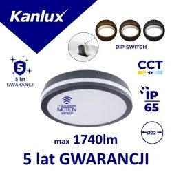 Plafoniera LED, Średnica [mm]: 220, Wysokość [mm]: 57, Barwa światła: ciepłobiała,biała, Czas działania czujnika [sekunda-minuta]: 5-5, Czas nagrzewania lampy [s]: ≤1, Czas zapłonu lampy [s]: ≤0,5, Częstotliwość pracy czujnika [MHz]: 5800, Częstotliwość znamionowa [Hz]: 50, Ilość cykli wł/wył: ≥30000, Jednolitość barw [SDCM]: 6, Kąt świecenia [°]: 110, Klasa ochronności przed porażeniem elektrycznym: II, Kolor: grafitowy, Materiał klosza: PC, Materiał obudowy: PC, Miejsce montażu: do nadbudowania na ścianie, Miejsce montażu: do nadbudowania na suficie, Miejsce zastosowania: wewnątrz i na zewnątrz, Minimalna odległość od oświetlanego obiektu: 0,5m, Moc maksymalna [W]: 12 / 18, Możliwość współpracy ze ściemniaczem: nie, Napięcie znamionowe [V]: 220-240 AC, Nastawa poziomu natężenia oświetlenia, przy którym czujnik wykrywa ruch [lx]: 2/10/50/off, Regulacja czułości: 1, Rodzaj czujnika: mikrofalowy, Rodzaj diody: LED SMD, Rodzaj przyłącza: kostka samozaciskowa, Stopień IP: 65, Strumień świetlny oprawy [lm]: max 1610 / 1740 / 1740, Temperatura barwowa [K]: 3000/3500/4000, Trwałość [h]: 50000, Współczynnik oddawania barw Ra: 80, Wykrywanie ruchu: tak, Zakres przekrojów stosowanych przewodów [mm2]: 0,75÷1,5, Zakres temperatury otoczenia, na którą może być narażony wyrób [°C]: -15÷35, Zawartość rtęci: nie, Zintegrowane źródło światła LED: 1, Zastosowana technologia oświetleniowa: LED, Bezkierunkowe lub kierunkowe źródło światła: NDLS, Źródło światła zasilane lub niezasilane napięciem sieciowym: NMLS, Połączone źródło światła (CLS): nie, Źródło światła z możliwością zmiany barwy światła: nie, Źródło światła o wysokiej luminancji: nie, Osłona przeciwolśnieniowa: nie, Funkcja ściemniania: nie, Wartość wskaźnika oddawania barw R9: 0, Współczynnik zachowania strumienia świetlnego: 0,95, Współczynnik trwałości: 0,9, Współrzędne chromatyczności (x): 0.44, Współrzędne chromatyczności (y): 0,403, Dodatkowe informacje: Produkt wyposażony (CP), Gwarancja: 5.