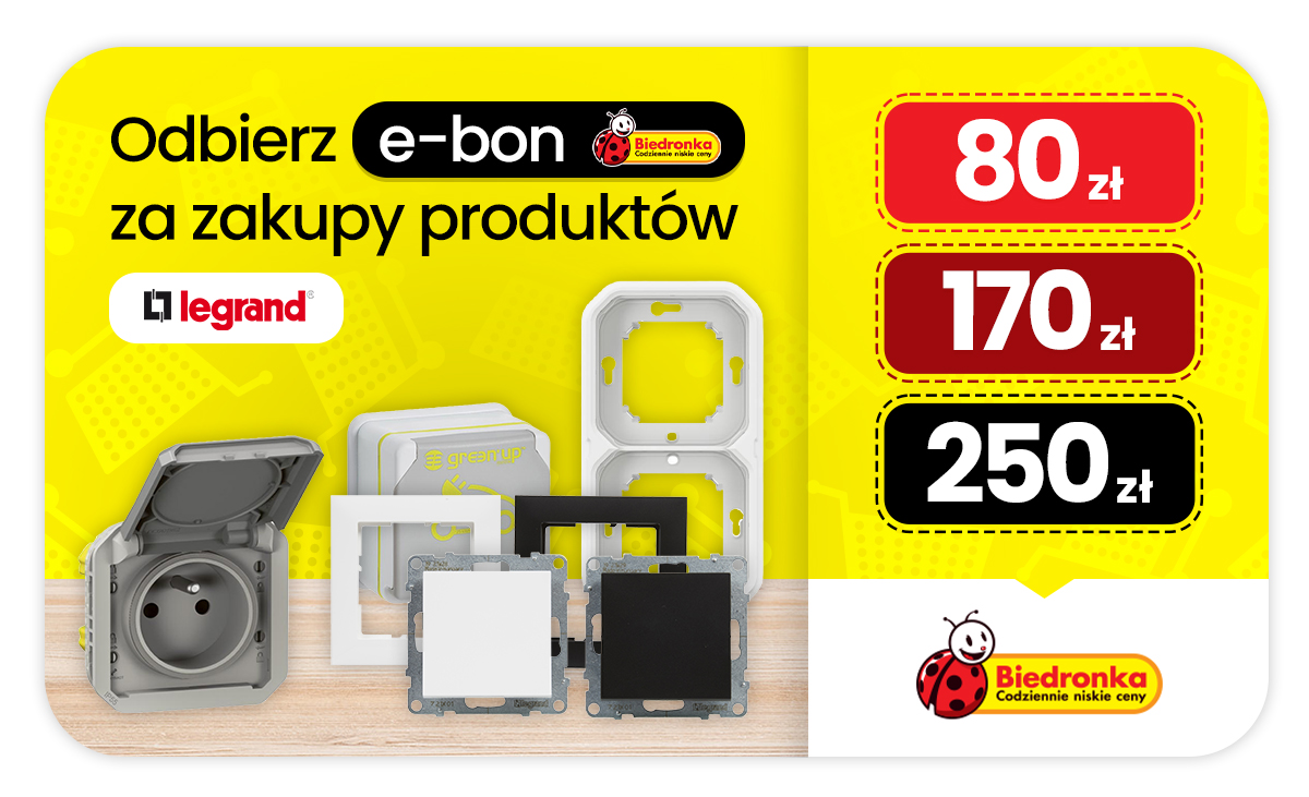 Kupuj produkty marki LEGRAND na kwotę pomiędzy 999 - 1499 zł netto, a otrzymasz e-bon do Biedronki o wartości 80 zł lub pomiędzy 1499 - 1999 zł, a otrzymasz e-bon do Biedronki o wartości 170 zł lub powyżej 1999 zł, a otrzymasz e-bon do Biedronki o wartości 250 zł za 1 zł netto.
