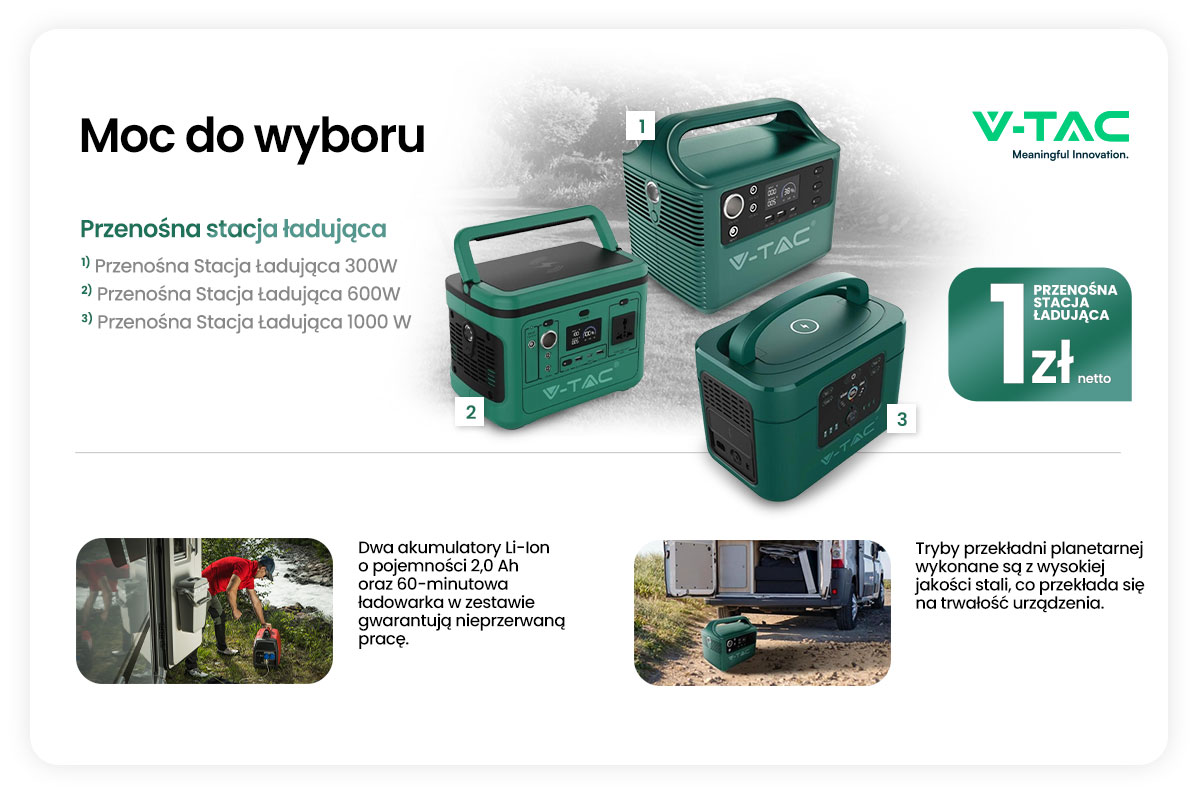 Kupuj pompy ciepła/ panele fotowoltaiczne marki V-TAC oznaczone ikoną prezentu na kwotę powyżej- 7 499 zł netto, a otrzymasz Przenośna Stacja Ładująca 300W lub na kwotę powyżej 14 999 zł netto, a otrzymasz Przenośna Stacja Ładująca 600W lub na kwotę powyżej 19 999 zł zł netto, a otrzymasz Przenośna Stacja Ładująca 1000W za 1 zł netto.