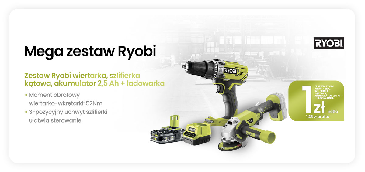 Kup w ramach pojedynczego zamówienia produkty marki SCHNEIDER ELECTRIC na kwotę powyżej 9 999 zł netto, a otrzymasz Zestaw Ryobi wiertarka, szlifierka kątowa, akumulator 2,5 Ah + ładowarka, za 1 zł netto.