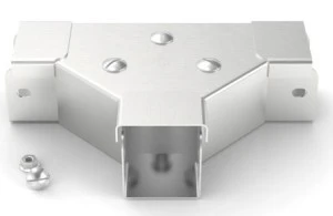 Trójnik równy/przednia pokrywa lid. Lid łącznika jest przymocowana za pomocą środkowych mocowań 90° zabezpiecza pokrywkę lid W komplecie znajdują się szybko zdejmowane pokrywy, co ułatwia dostęp Klasa IP4X.