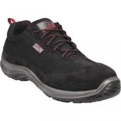 Półbuty z dwoiny welurowej i poliestru typu mesh, podeszwa z dwuwarstwowego poliuretanu o zróżnicowanych gęstościach, podnosek i wkładka kompozytowe Cholewka: welur skórzany i poliester typu mesh. Podszewka: poliester. Wkładka: wymienna, poliester na piance EVA. Podeszwa: wtryskiwana, dwuwarstwowy poliuretan o zróżnicowanych gęstościach. Obuwie amagnetyczne, kolor czarny rozmiar 36, zarkes rozmiarów: 36 DO 48