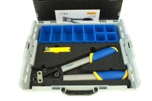 Profesjonalny zestaw walizkowy LBOXX17 z praska do kabli K05 został zaprojektowana pod kątem najcięższych prac elektroinstalacyjnych. Zaciskarka została wyposażona w dwukomponentowe rączki co zapewnia pewny i wygodny uchwyt. Stabilna i przystosowana do użytku zewnętrznego i wewnętrznego konstrukcja zapewnia obsługę przewodów w zakresie 6-50 mm².