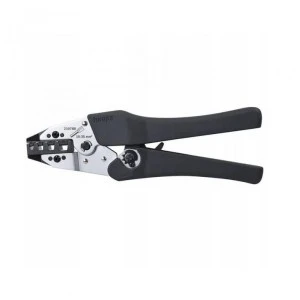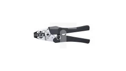 Praska do końcówek tulejkowych, poręczny kształt z 20% zakrzywieniem głowicy, ze zwalnianą blokadą wymuszoną, nacisk zaciskowy regulowany, zacisk trapezowy