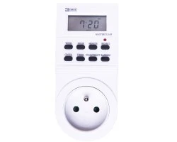 W ofercie firmy znajduje się bogaty wybór programatorów czasowych, których powyższa wersja jest cyfrowa. Gniazdo, które dołączono do panelu posiada bolec uziemiający dla większego bezpieczeństwa. Urządzenie to jest przeznaczone do pracy w pomieszczeniach zamkniętych. Jak informuje symbol stopnia ochrony IP20, produkty te nie są odporne na działanie wilgoci i zanieczyszczeń. Artykuł wyposażono w zegar tygodniowy. Programator można zamontować za pomocą adaptera wtykowego z gniazdkiem. Minimalny czas przełączenia wynosi w tym przypadku 1 min.