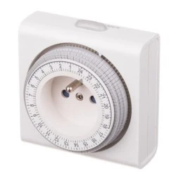 Programator mechaniczny 24-godzinny do sterowania urządzeniami elektrycznymi z możliwością ustawienia czasu z dokładnością do 15minut ( wciskamy/wyciskamy 1-"ząbek" na zegarze).