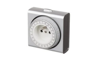 Programator mechaniczny 24-godzinny do sterowania urządzeniami elektrycznymi z możliwością ustawienia czasu z dokładnością do 15minut ( wciskamy/wyciskamy 1-"ząbek" na zegarze).