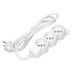 Przedłużacz 3-krotny, to łatwe w użytku i bezpieczne rozwiązanie przeznaczone dla biur i gospodarstw domowych. Produkt w kolorze białym, wyposażony w: 3 gniazda sieciowe 2P+Z typu francuskiego, przewód H05VV-F 3x1,5 mm2, o długości 1,5m, płaską wtyczkę z wygodnym uchwytem, przesłony torów prądowych, wygodną zawieszkę, jeżeli potrzebujesz np. powiesić listwę na ścianie, izolację PCV.
