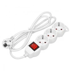 Biały przedłużacz z wyłącznikiem i 3 gniazdami, 2P+Z (schuko) i kablem o długości 1,5m. Służy do podłączenia kilku urządzeń do jednego źródła prądu.