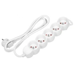 Przedłużacz 5-krotny, to łatwe w użytku i bezpieczne rozwiązanie przeznaczone dla biur i gospodarstw domowych. Produkt w kolorze białym, wyposażony w: 5 gniazd sieciowych 2P+Z typu francuskiego, przewód H05VV-F 3x1,5 mm2, o długości 3m, płaską wtyczkę z wygodnym uchwytem, przesłony torów prądowych, wygodną zawieszkę, jeżeli potrzebujesz np. powiesić listwę na ścianie, izolację PCV.