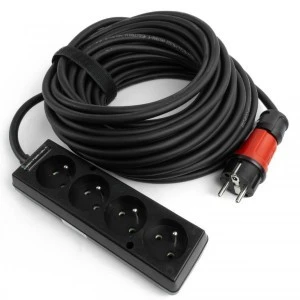 Przedłużacz Doktorvolt DV-4940-F ma 15 metrów długości i jest wyposażony w cztery gniazda 2p+Z oraz wtyczkę uni-schuko 16A 230V IP44. Jest wykonany z czarnej gumy, co zapewnia jego trwałość. Dodatkowo, zestaw zawiera rzep do kabli, ułatwiający organizację i przechowywanie.