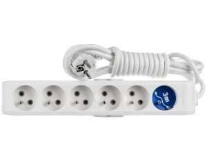 Przenośny przedłużacz 6-krotny z bolcami ochronnymi i przesłonami styków, przeznaczony do zasilania urządzeń z uziemieniem w warunkach domowych, biurowych i warsztatowych. Produkt ma przewód zasilający o długości 3 m i konstrukcję umożliwiającą podłączanie wtyczek o różnych gabarytach dzięki kątowemu ustawieniu gniazd.