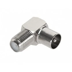 Popularna, solidna i łatwa w montażu metalowa wtyczka antenowa kątowa nakręcana na przewód antenowy zakończony wtykiem typu F.