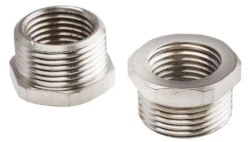 Złączki gwintowane ogólne. Niklowane mosiężne złączki gwintowane, używane do zamiany PG na gwinty metryczne lub do dostosowania się pomiędzy poszczególnymi gwintami. Idealne do zmiany pozycji gwintowanych w przyciskach, wyłącznikach krańcowych itp.