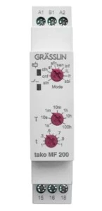 tako MF 200 to elektroniczny przekaźnik czasowy z 10 różnymi, dowolnie wybieranymi funkcjami. Dzięki temu jedno urządzenie nadaje się do szerokiego zakresu zastosowań, począwszy od prostego włączania / wyłączania obwodów, przez sterowanie silnikami, pompami i zaworami, kończąc na obsłudze schodów ruchomych czy drzwi automatycznych. Sposób działania poszczególnych funkcji został graficznie przedstawiony m.in. na obudowie przekaźnika. Tako MF 200 przeznaczony jest do montażu na szynach typu top-hat.