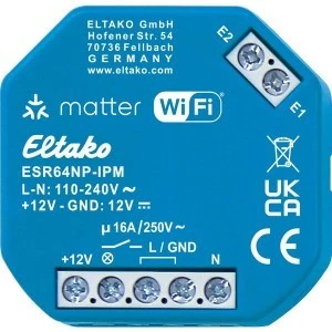 Przekaźnik impulsowy z IP, Matter przez Wi-Fi, opcjonalnie EnOcean, 1 styk zwierny nie bezpotencjałowy 16 A/250 V AC, lampy LED 230 V do 600 W, żarówki i lampy halogenowe 230 V 2000 W. REST-API. Strata w trybie czuwania tylko 0,7 W. Do montażu podtynkowego. 46 x 45 mm, głębokość 20 mm. Zaciski przyłączeniowe są zaciskami śrubowymi dla przekrojów przewodów do 2,5 mm². Przełączanie styków w punkcie przejścia przez zero w celu ochrony styków i lamp. Napięcie zasilania 12 V DC lub 110–230 V AC, napięcie przełączania i sterowania 12 V DC lub 110–230 V AC. Napięcie przełączania, sterowania i zasilania musi mieć ten sam potencjał. Najnowocześniejsza technologia hybrydowa łączy zalety bezzużyciowego sterowania elektronicznego z wysoką wydajnością specjalnych przekaźników. Z wejściem sterującym dla ewentualnie zamontowanego przed nim przycisku sterującego lub przełącznika. Prąd lampy jarzeniowej nie jest dozwolony. Połączenie Wi-Fi wykorzystuje pasmo częstotliwości 2,4 GHz i umożliwia aktualizacje bezprzewodowe (OTA). Ten aktuator posiada certyfikat Matter i dlatego może być zaprogramowany w różnych ekosystemach i obsługiwany równolegle. Do sterowania za pomocą Matter wymagany jest kompatybilny kontroler Matter, zależny od ekosystemu. Na przykład dla Apple Home jest to Homepod mini, dla Amazon Alexa kompatybilny Echo Dot, a dla Google Home Nest mini. Opcjonalna konfiguracja aktuatora odbywa się za pomocą aplikacji ELTAKO Connect. Wersja rozwojowa REST-API zgodnie ze specyfikacją OpenAPI jest dostępna na stronie internetowej produktu. Jest ona stale rozwijana. Zakres funkcji można rozszerzyć za pomocą adapterów wtykowych. Adapter EnOcean (EOA64) umożliwia dostęp do ekosystemu EnOcean. Więcej informacji na ten temat można znaleźć na stronie produktu danego adaptera.