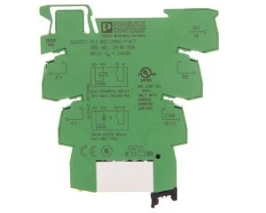PLC-INTERFACE do funkcji wyjściowych, składa się ze złączki gniazdowej PLC-BSC.../ACT z połączeniem śrubowym i wtykowym przekaźnikiem miniaturowym z zestykiem mocy, do montażu na szynie nośnej NS 35/7,5, 1 zestyk zwierny, napięcie wejściowe 24 V DC