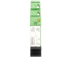 Interfejs PLC, składający się z podstawy PLC-BSC.../21 ze złączami śrubowymi i wtykowego przekaźnika miniaturowego ze stykiem prądowym, do montażu na szynie montażowej NS 35/7,5, 2 zestyki przełączne, napięcie wejściowe 230 V AC/ 220 V DC