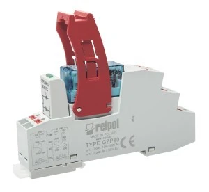 Przekaźnik interfejsowy PUSH-IN: 2P - dwa zestyki przełączne, napięcie zasilania Un - 24 V DC, materiał stykowy AgNi. AC1 - 8 A / 250 V AC; DC1 - 8 A / 24 V DC. Wymiary: 97 x 15,9 x 75,8 mm. Montaż na szynie 35 mm lub na płycie montażowej jednym wkrętem M3. Przystosowane do współpracy ze złączami grzebieniowymi typu ZGZP. Zestaw zawiera: gniazdo push-in GZP80, przekaźnik RM84 w przeźroczystej niebieskiej obudowie, obejmę wyrzutnikową GZP80-0400 oraz moduł przeciwprzepięciowy M41G (LED zielony + dioda tłumiąca D, polaryzacja N: +A1/-A2)