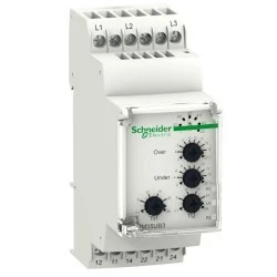 Przekaźnik kontroli napięcia RM35-U, zakres 194...528 V AC. rodzina produktów: Zelio Control - typ produktu: modułowe przekaźniki sterownicze i pomiarowe - typ przekaźnika: przekaźnik sterowania napięciem - specjalne zastosowanie produktu: do 3-fazowego zasilania - nazwa przekaźnika: RM35UB3 - parametry monitorowane przez przekaźnik: nieobecność neutralnego, przepięcie i zmniejszenie się wartości napięcia między fazami, przepięcie i zmniejszenie się wartości napięcia między neutralnym - zdolność łączeniowa w VA: 1250 VA - Kategoria użytkowania: AC-12 zgodnie z IEC 60947-5-1, AC-13 zgodnie z IEC 60947-5-1, AC-14 zgodnie z IEC 60947-5-1, AC-15 zgodnie z IEC 60947-5-1, DC-12 zgodnie z IEC 60947-5-1, DC-13 zgodnie z IEC 60947-5-1, DC-14 zgodnie z IEC 60947-5-1. Zalety: Prostota sterowania. Prostota precyzja regulacji są gwarancją szybkiego i łatwego skonfigurowania. Przekaźniki te są w stanie zaspokoić wszelkie potrzeby dotyczące kontroli procesów oraz wyposażenia sieciowego.... Zastosowanie: -. Przemysł i budownictwo: tablice rozdzielcze do prostych maszyn., Rozruch i monitorowanie urządzeń do uzdatniania wody..