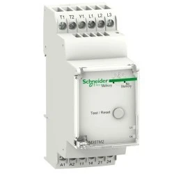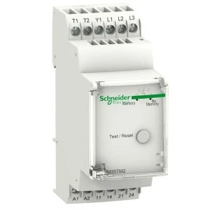 Przekaźnik kontroli napięcia silnika i temperatury- RM35-T- 24..240 V AC/DC- 2NO. rodzina produktów: Zelio Control - typ produktu: modułowe przekaźniki sterownicze i pomiarowe - typ przekaźnika: przekaźnik do kontrolowania temperatury silnika - specjalne zastosowanie produktu: do 3-fazowego zasilania - nazwa przekaźnika: RM35TM - parametry monitorowane przez przekaźnik: kolejność faz, przycisk test/reset, temperatura silnika poprzez czujnik PTC, wybór (z lub bez pamięci), wykrywanie uszkodzenia fazy - zdolność łączeniowa w VA: 1250 VA - zakres pomiarowy: 0...20 Ohm wykrycie zwarcia, 208...480 V napięcie AC. Zalety: Prostota sterowania. Prostota precyzja regulacji są gwarancją szybkiego i łatwego skonfigurowania. Przekaźniki te są w stanie zaspokoić wszelkie potrzeby dotyczące kontroli procesów oraz wyposażenia sieciowego.... Zastosowanie: -. Przemysł i budownictwo: tablice rozdzielcze do prostych maszyn., Rozruch i monitorowanie urządzeń do uzdatniania wody..