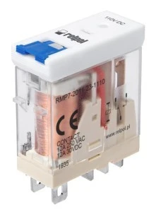 Przekaźniki miniaturowe 1P. Materiał styków: AgNi. Napięcie cewki 110 V DC. Wyposażenie standardowe: dioda sygnalizacyjna LED (czerwony AC, zielony DC), wskaźnik zadziałania mechaniczny, przycisk testujący czołowy z funkcja blokowania styków. Montaż: do gniazd wtykowych GZ71, GZP71