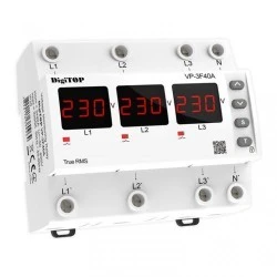 Przekaźnik napięciowy trójfazowy VP-3F40A przeznaczony jest do ochrony odbiorników jednofazowych lub trójfazowych przed wahaniami napięcia, asymetrią faz, utratą faz, kontrolą kolejności faz. Urządzenie zapobiega awariom i przedłuża żywotność urządzeń elektrycznych. Z możliwością wyboru trybu pracy jako trójfazowy lub trzy niezależne przekaźniki jednofazowe.