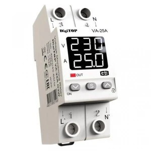 Przekaźnik napięciowy VA-25A G3W z kontrolą prądu przeznaczony jest do ochrony urządzeń elektrycznych i sprzętu gospodarstwa domowego przed niedopuszczalnymi wahaniami napięcia. Urządzenie w sposób ciągły analizuje napięcie sieciowe i w przypadku jego przekroczenia następuje wyłączenie podłączonych urządzeń, a obciążenie zostaje załączone automatycznie po powrocie napięcia do zadanego zakresu. Użytkownik ustawia wymaganą górną i dolną granicę napięcia oraz czas opóźnienia załączenia.