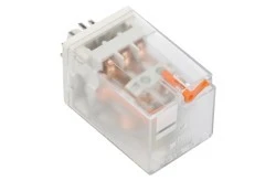 Przekaźnik przemysłowy elektromagnetyczny o małych gabarytach. Produkt przeznaczony jest do gniazda wtykowego, które umożliwia montaż na szynie lub płycie. Do zestawu przekaźnik plus gniazdo należy dopasować odpowiednią obejmę. Szerokość przekaźnika wynosi w tym przypadku 35 mm, ma 3 zestyki przełączne, wskaźnik zadziałania mechaniczny W oraz przycisk testujący T. Posiada praktyczną nowoczesną, przezroczystą obudowę.
