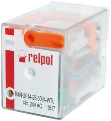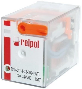 Przekaźnik elektromagnetyczny, przemysłowy - miniaturowy, do gniazda wtykowego. Szerokość 21,2 mm. Wyjście: 4P - cztery zestyki przełączne - wyprowadzenia: 11(9), 12(1), 14(5); 21(10), 22(2), 24(6); 31(11), 32(3), 34(7); 41(12), 42(4), 44(8); AC1 - 6 A / 250 V; DC1 - 6 A / 24 V. Wejście / cewka - wyprowadzenia: A1(13) - A2(14), napięcie zasilania Un - 24 V AC. Wskaźnik mechaniczny W, wskaźnik LED czerwony L, przycisk testujący T z funkcją blokowania. Wymiary: 27,5 x 21,2 x 35,6 mm. IP 40. Materiał styków: AgNi. Pasujące gniazda: GZT4, GZM4, GZ4, GS4, GZP4, SU4D, SU4L, G4.