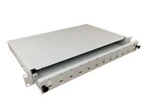Panel światłowodowy z wysuwalną tacką do montażu w szafach i stojakach 19", 12 portów SC duplex / 12 portów LC quad, kolor szary.