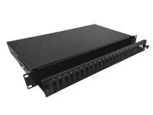 Panel światłowodowy z wysuwalną tacką do montażu w szafach i stojakach 19", 24 porty SC duplex / 24 porty LC quad, kolor czarny.