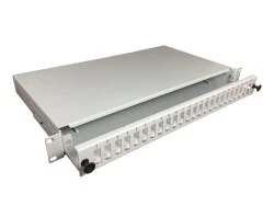 Panel światłowodowy z wysuwalną tacką do montażu w szafach i stojakach 19", 24 porty SC duplex / 24 porty LC quad, kolor szary.